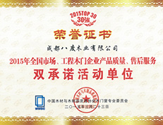 4、被评为“2015年全国市场、工程木门企业产品质量、售后服务双承诺活动单位”;